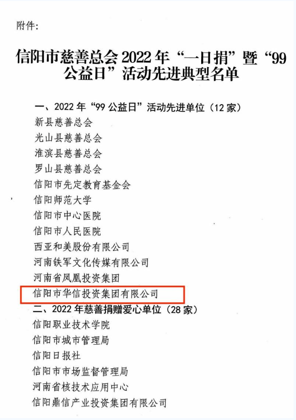 8月24日,在信陽市2023年“公益慈善月”暨“99公益日”活動動員會上,華信建投集團榮獲“2022年‘99公益日’活動先進(jìn)單位”榮譽稱號。